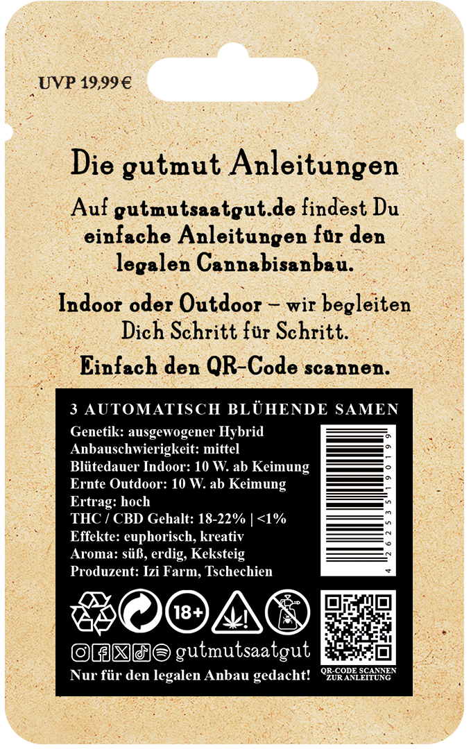 rotz ihres kompakten Aufbaus überzeugt diese Sorte mit einem hohen Ertrag. Indoor sind 450–500 Gramm pro Quadratmeter möglich, Outdoor bis zu 120 Gramm pro Pflanze. Robust und gleichmäßig wachsend, verzeiht sie kleine Anfängerfehler und liefert trotzdem kräftige Ergebnisse.