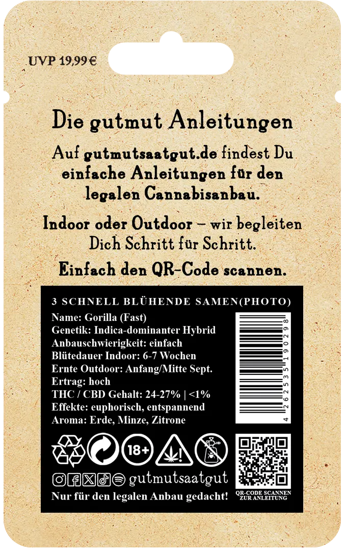 Mit nur 6–7 Wochen Blütezeit gehört Gorilla (Fast) zu den schnellsten photoperiodischen Sorten im Sortiment. Outdoor ist sie bereits Anfang bis Mitte September erntereif – ein klarer Vorteil im mitteleuropäischen Klima.